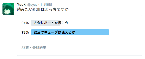 私は友人と社会人になる前の旅行をし、大阪でキュービストと遊び、そしてまた大阪で友人と遊ぶという面白いスケジュールを敢行していたために参加しませんでしたが、とても良い大会だったように思います。